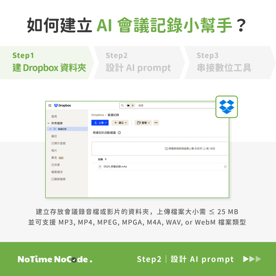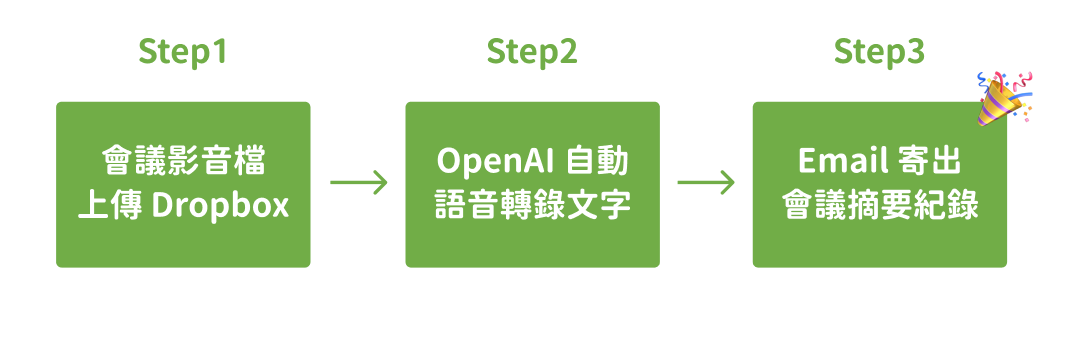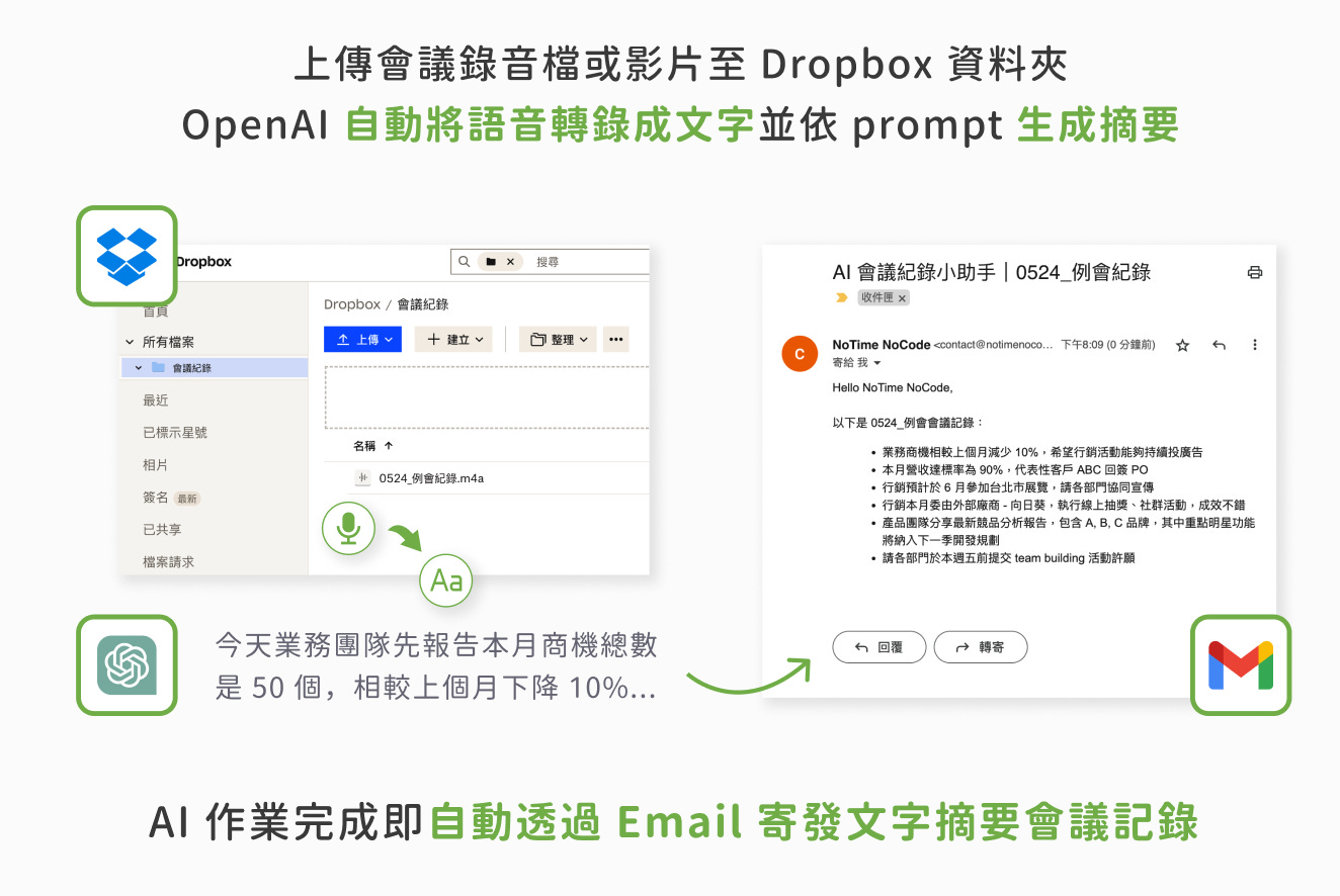 未來只要把影音檔存到 Dropbox 雲端硬碟後,就可以讓 AI 小幫手自動把影音檔轉成逐字稿並總結會議摘要,同時儲存會議紀錄到雲端硬碟與 Email 給自己,大大省下原本工作流程中的等待與手動處理時間~