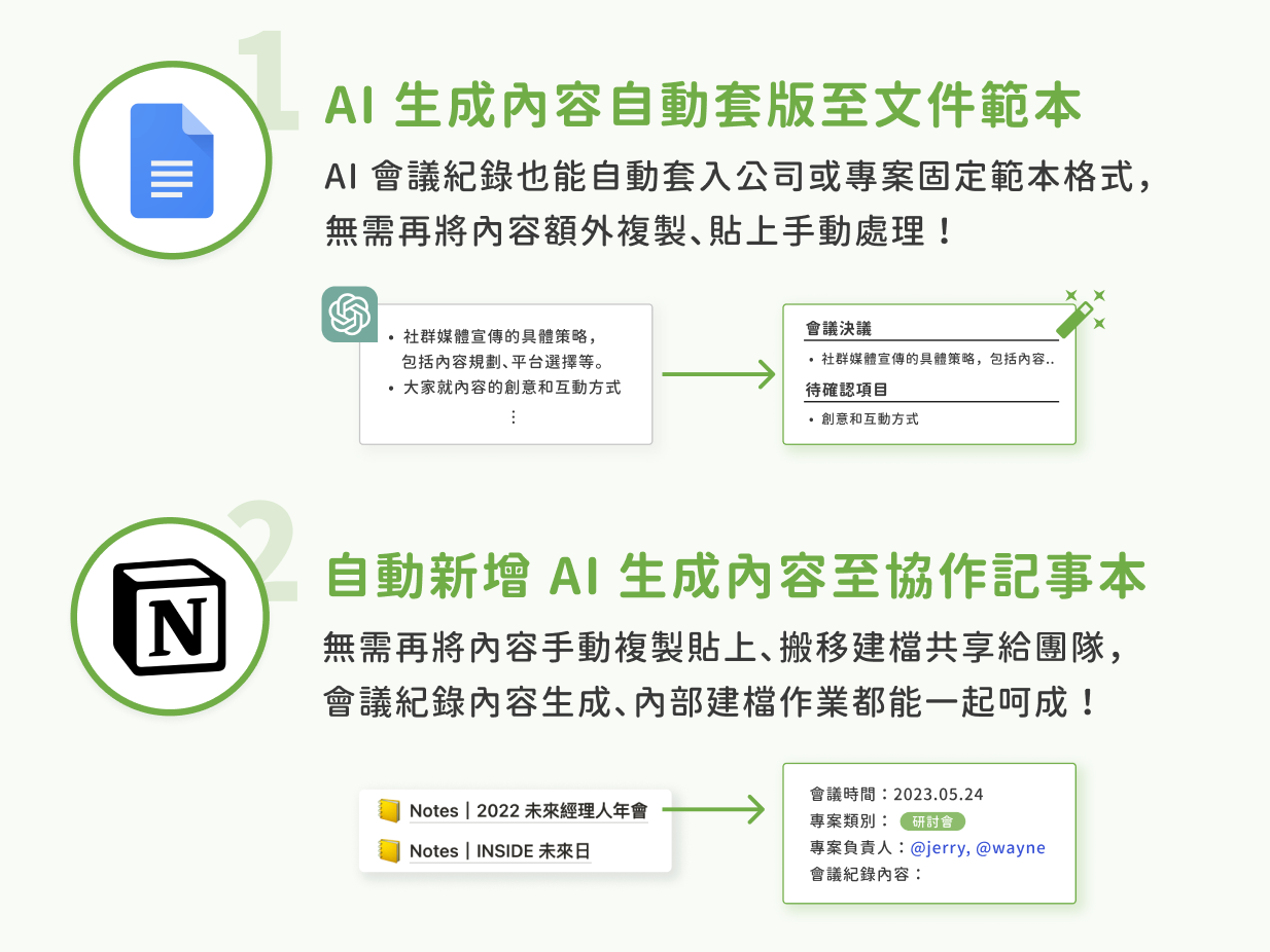 如果會議紀錄總需要依循固定格式,也能在 AI 會議紀錄之後自動將內容套版至文件範本,一氣呵成!