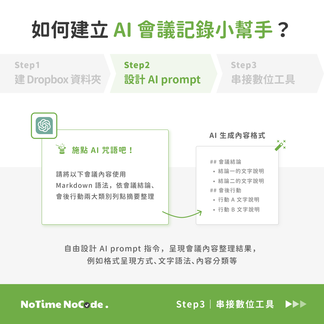 你可以根據個人喜好自由設計 AI prompt 指令,以呈現 ChatGPT 整理會議內容的結果,包括格式呈現方式、文字語法和內容分類等相關內容。