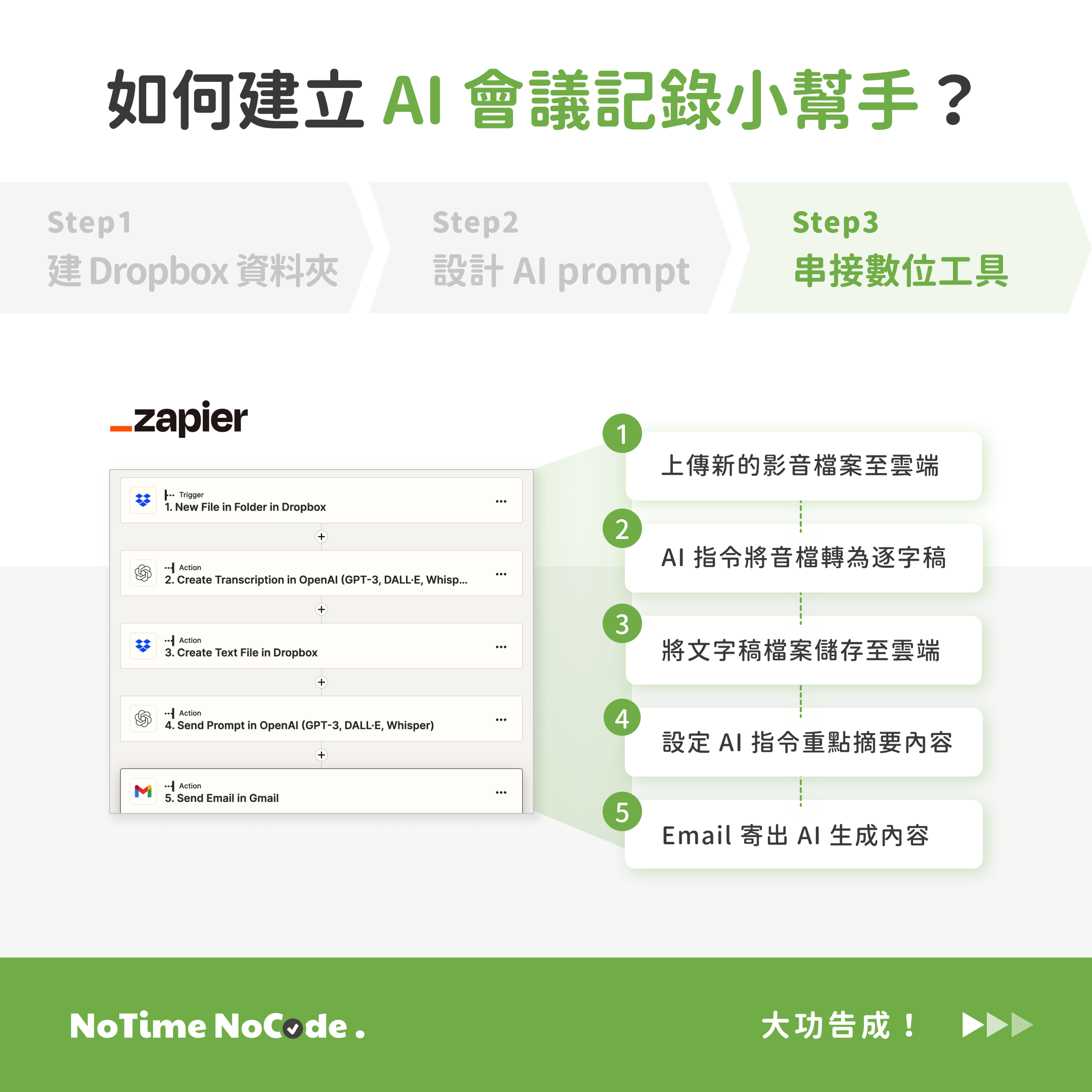最重要的一個步驟,我們會透過 Zapier 這個自動化工具 (可被稱為數位工具界的膠水),在完全不需要寫任何程式的情況下,將不同的數位軟體 (e.g. Dropbox、ChatGPT、Gmail) 串接整合在一起!