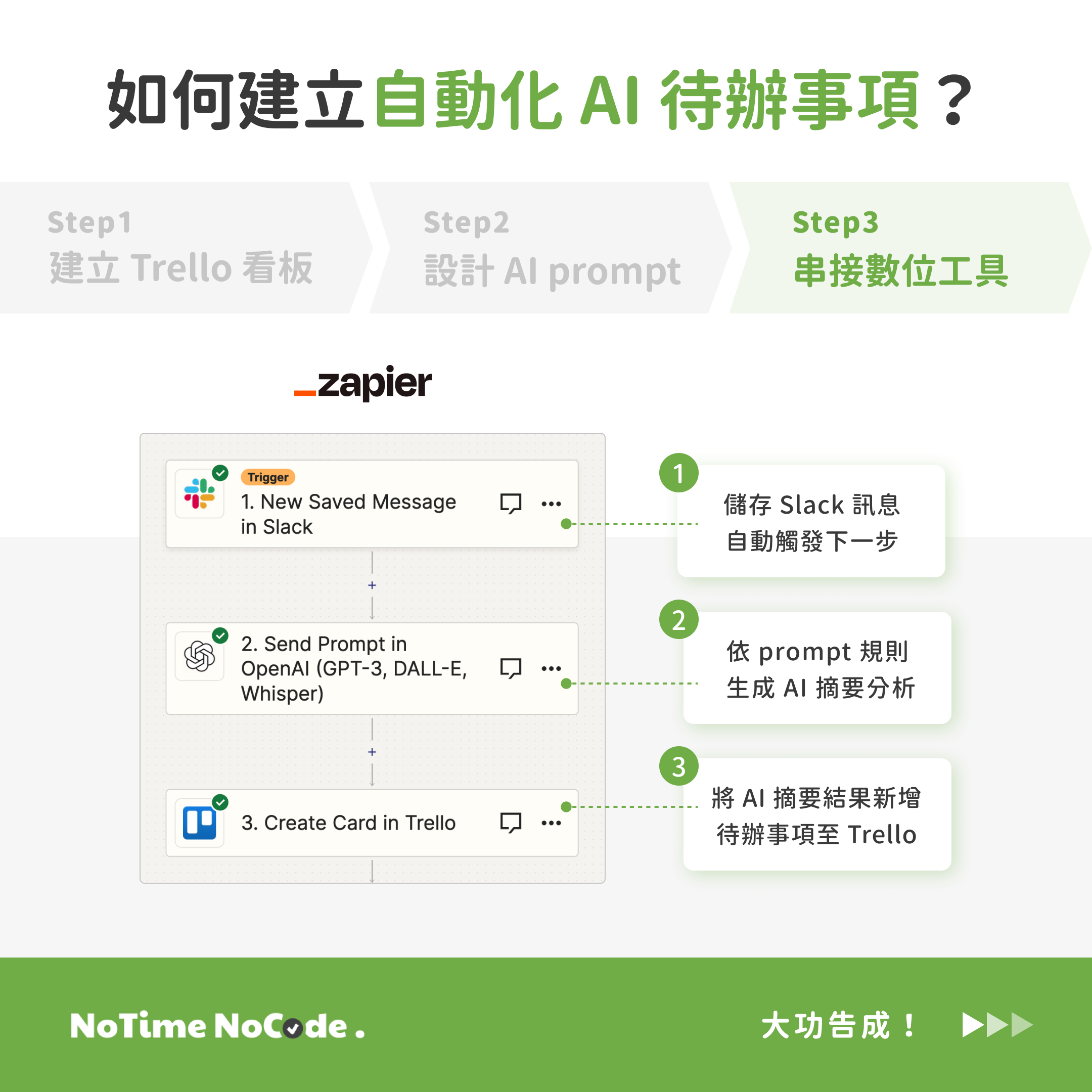 最重要的一個步驟,我們會透過 Zapier 這個自動化工具 (可被稱為數位工具界的膠水),在完全不需要寫任何程式的情況下,將不同的數位軟體 (Slack、ChatGPT、Trello) 串接整合在一起!