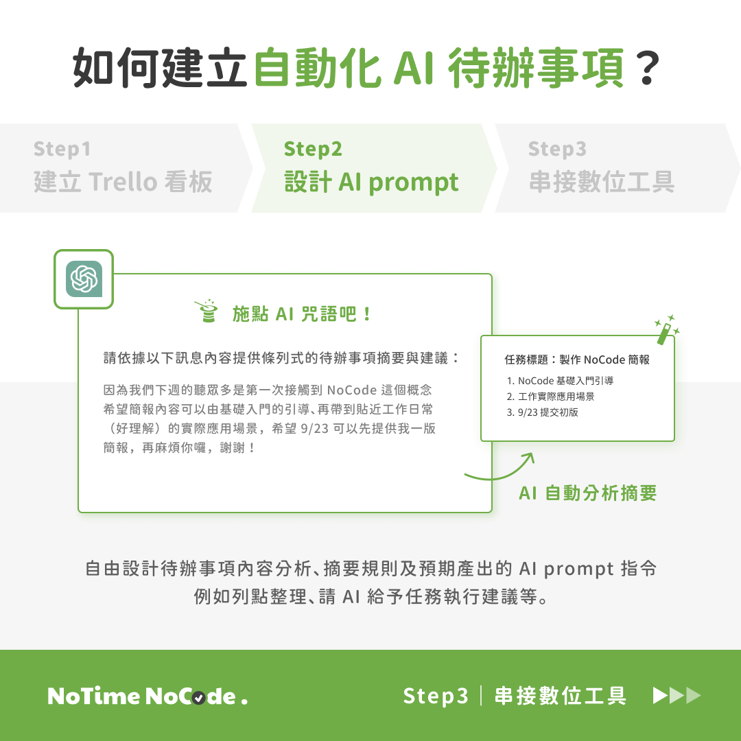 在這個步驟中,我們的目標是設計 AI 指令,讓 ChatGPT 能夠處理存儲在 Slack 的訊息內容,將其轉換為待辦事項並提供相關執行建議。