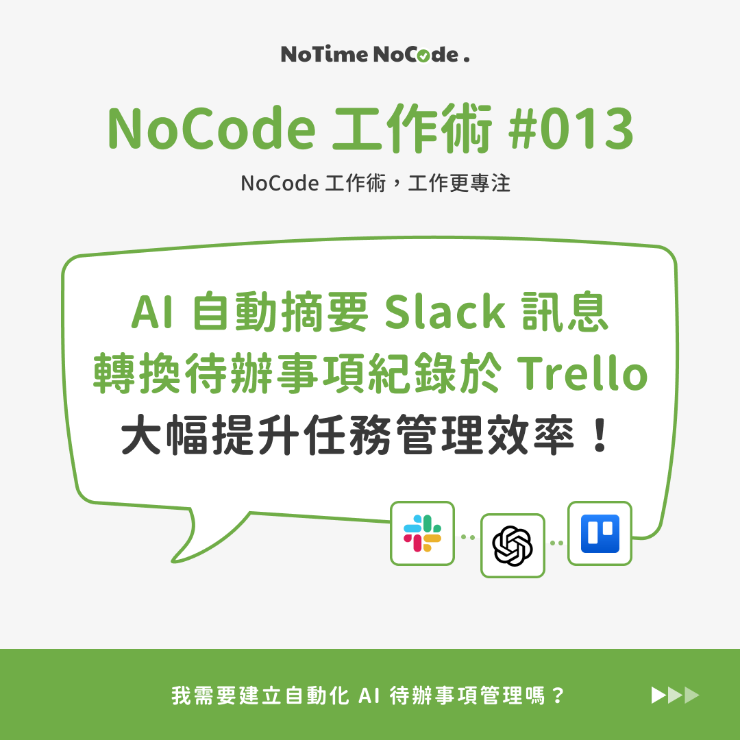 要建立一個 AI 自動摘要 Slack 訊息並轉為 Trello 待辦事項的流程,主要可分為三個主要的工具設定就可以完成囉!