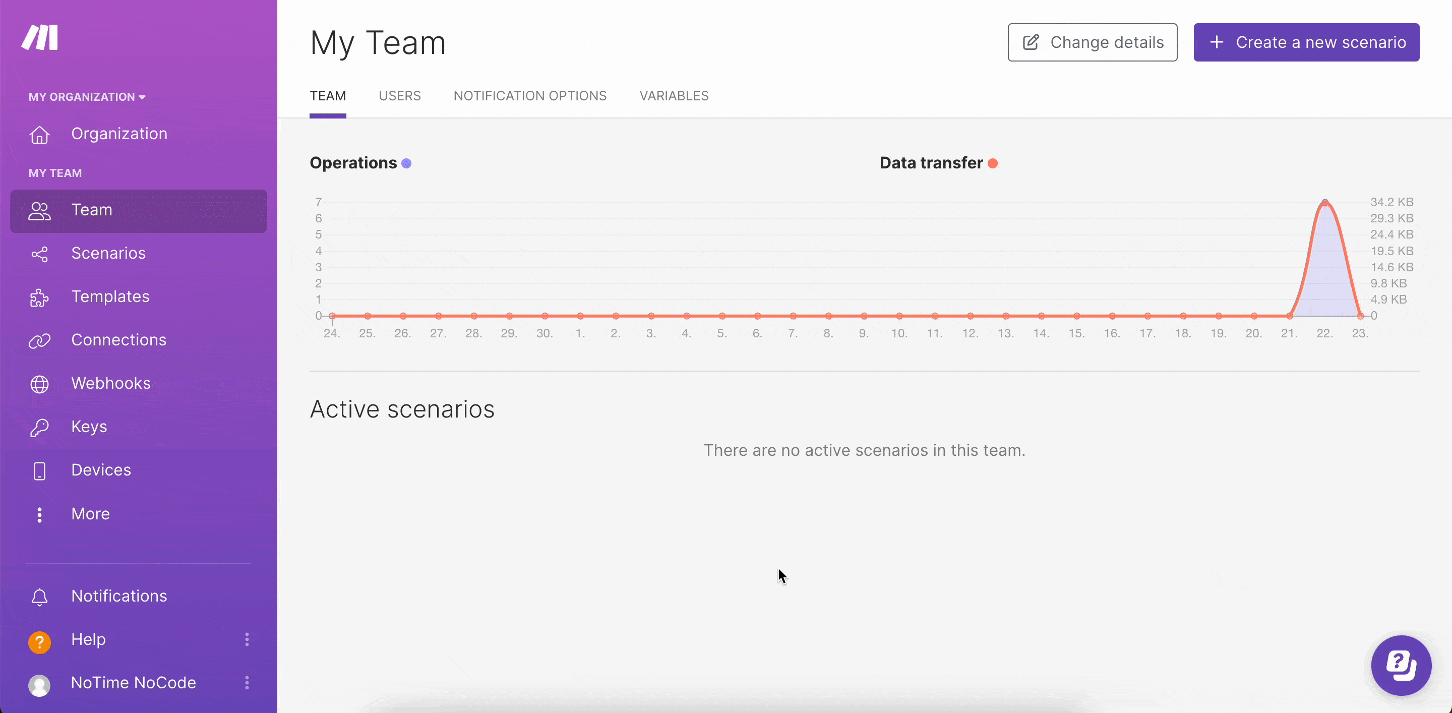 進入下一頁的右上角會有按鈕「+ Create a new scenario」可以建立新的流程