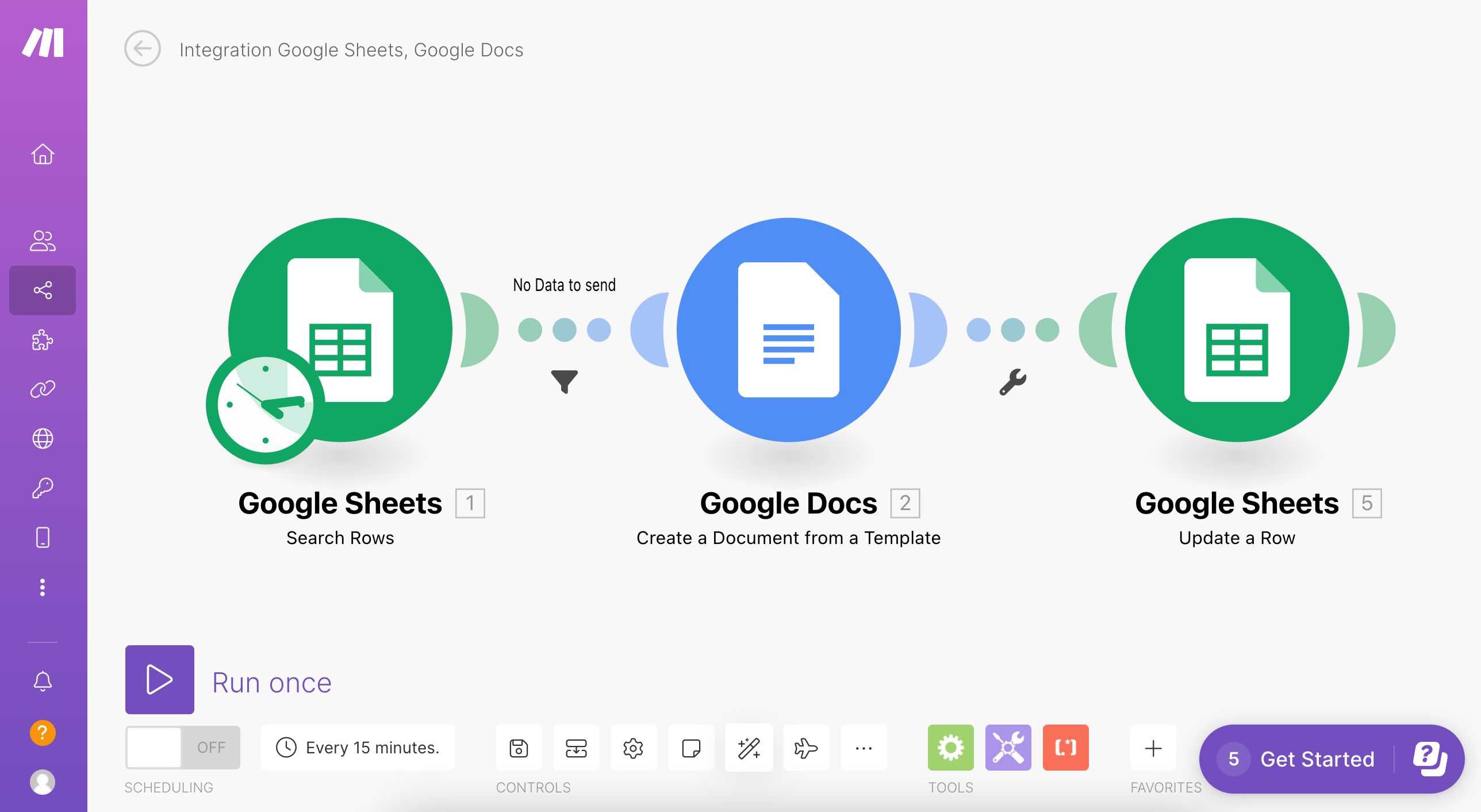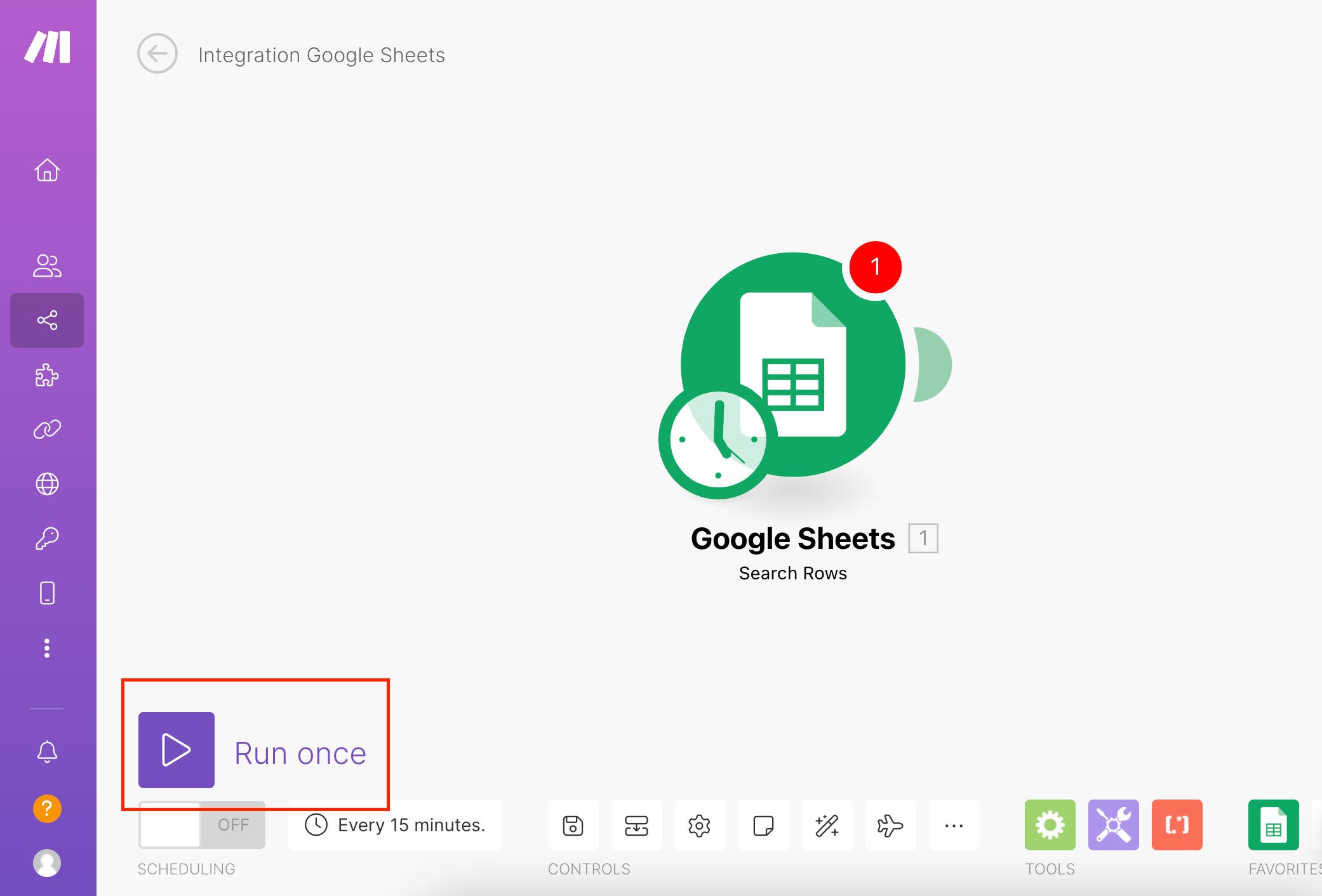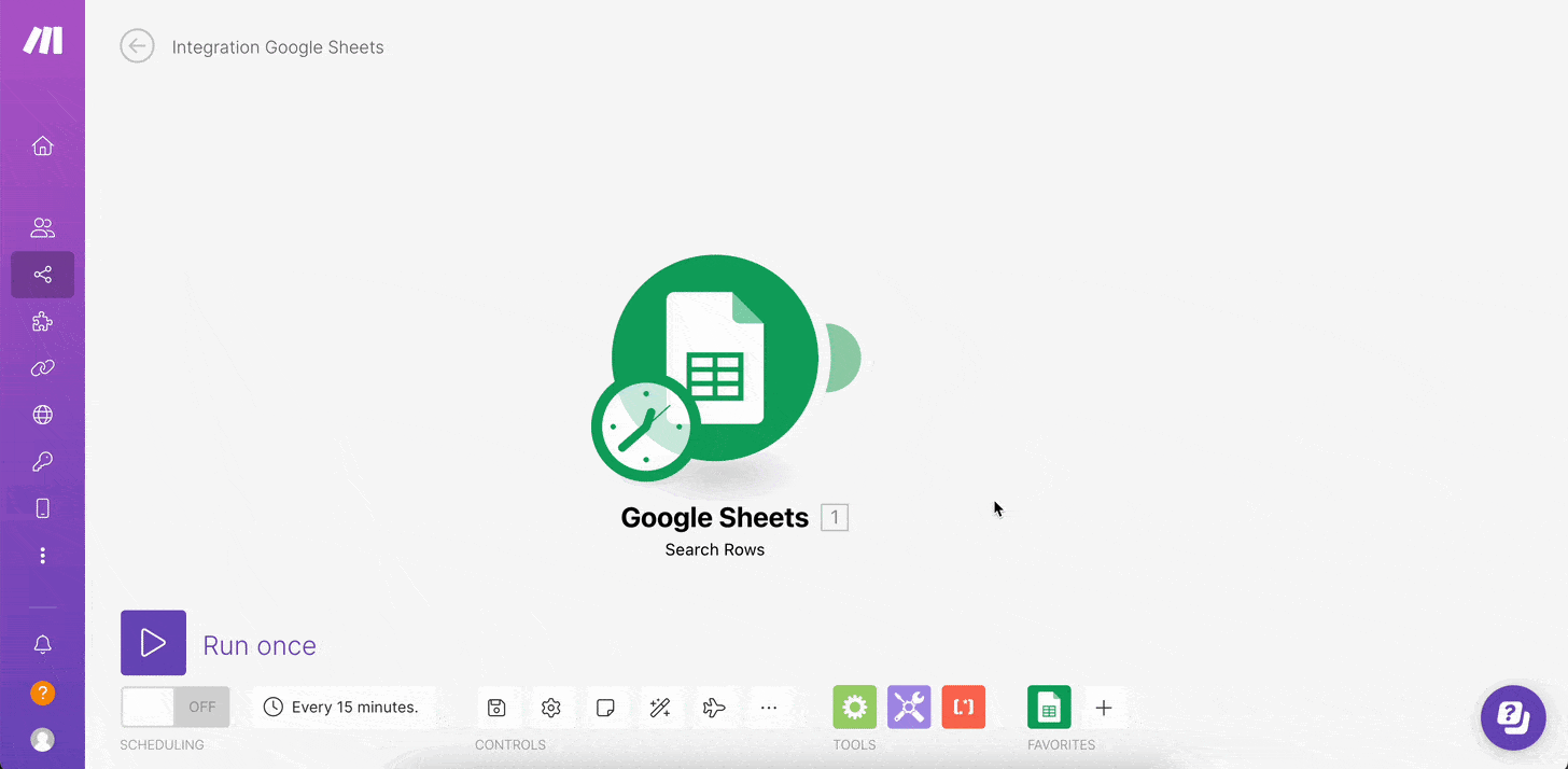 小提示: 通常在設定完第一個 Google Sheets 模組節點後,我會點擊整個畫面左下角的 Run Once 進行測試,看看資料是否有抓成功唷。若有成功,Google Sheets 模組右上角會出現一個白色的數字泡泡,點擊後將可以看到你原本建立於 Google 試算表內的資料—