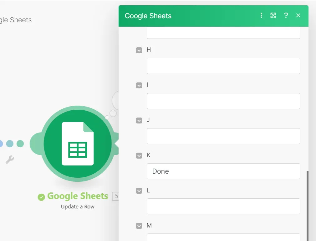 最後一步,新增一個新的 Google Sheets - Update a Row 模組節點。