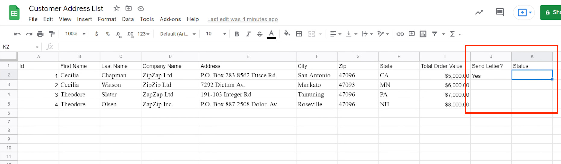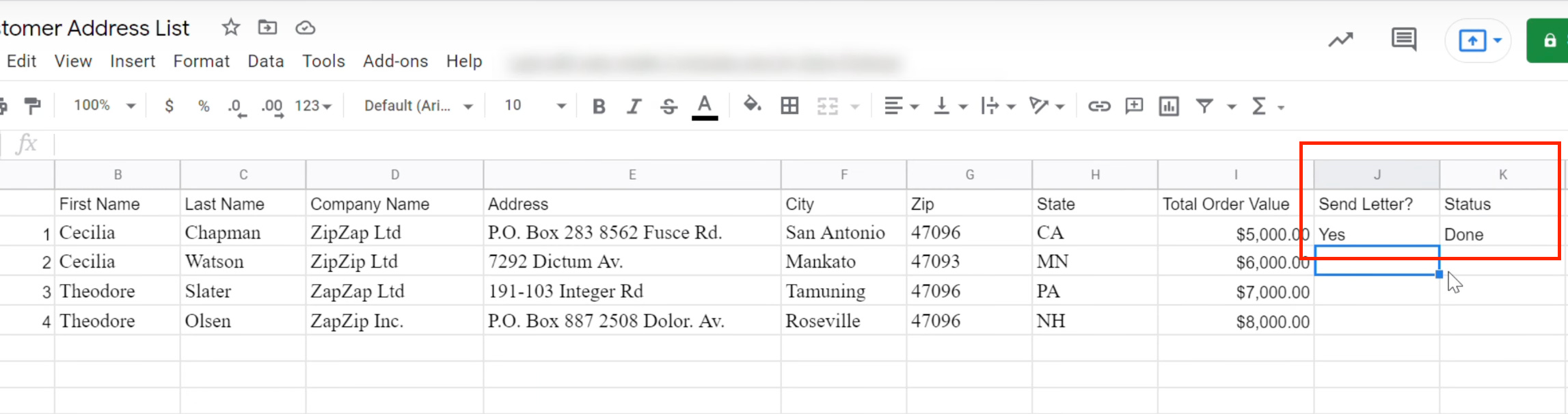 *注意:我們建議新增 2 個方便自動化工具辨別與回傳成功狀態的欄位。以截圖紅框為例,欄位分別是 “Send Letter?” & “Status“,讓系統自動回傳文件建立狀態,方便後續追蹤(欄位名稱可以依據喜好自訂唷)Step 3. 串接 Google 文件 (Google Docs) 和 Google 試算表 (Google Sheets)