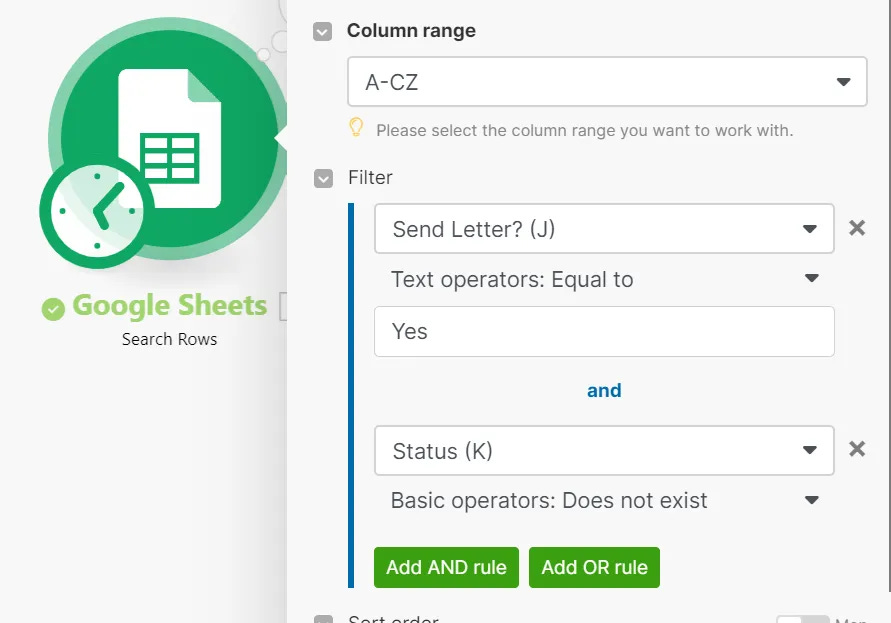 *注意: 還記得我們在 Step 2. 新增 2 個用於辨識文件套版狀態的欄位嗎?以此範例為 Send Letter & Status,所以也會在模組節點下方 Filter 處設定篩選條件唷~