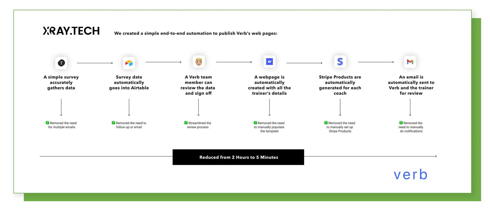健身公司 Verb 是一個提供 1 對 1 線上健康輔導的平台,過往透過 Email 溝通搜集合作教練的資料再手動將資訊上稿至網站,花費大量時間、人工作業容易出錯。 導入自動化即服務,將表單回收資料至自動創建教練資訊全部自動化!