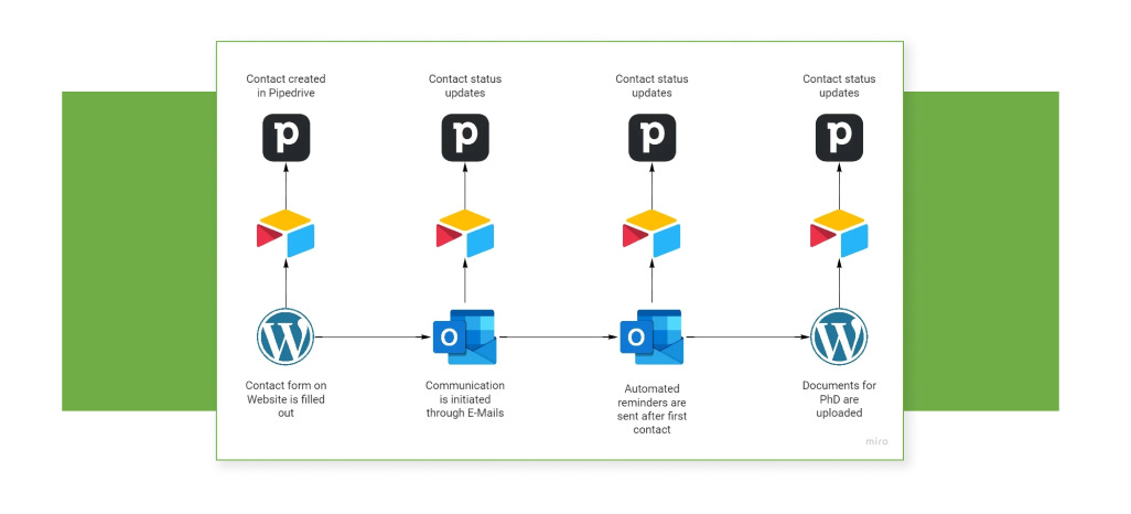 服務公司 Scentia 提供學校媒合服務,依據與顧客的信件來往內容,自動更新顧客資料及狀態於 CRM 系統,並依狀態自動發信跟進、追蹤進度,有效省下大量時間得以接觸更多顧客、增加業績!