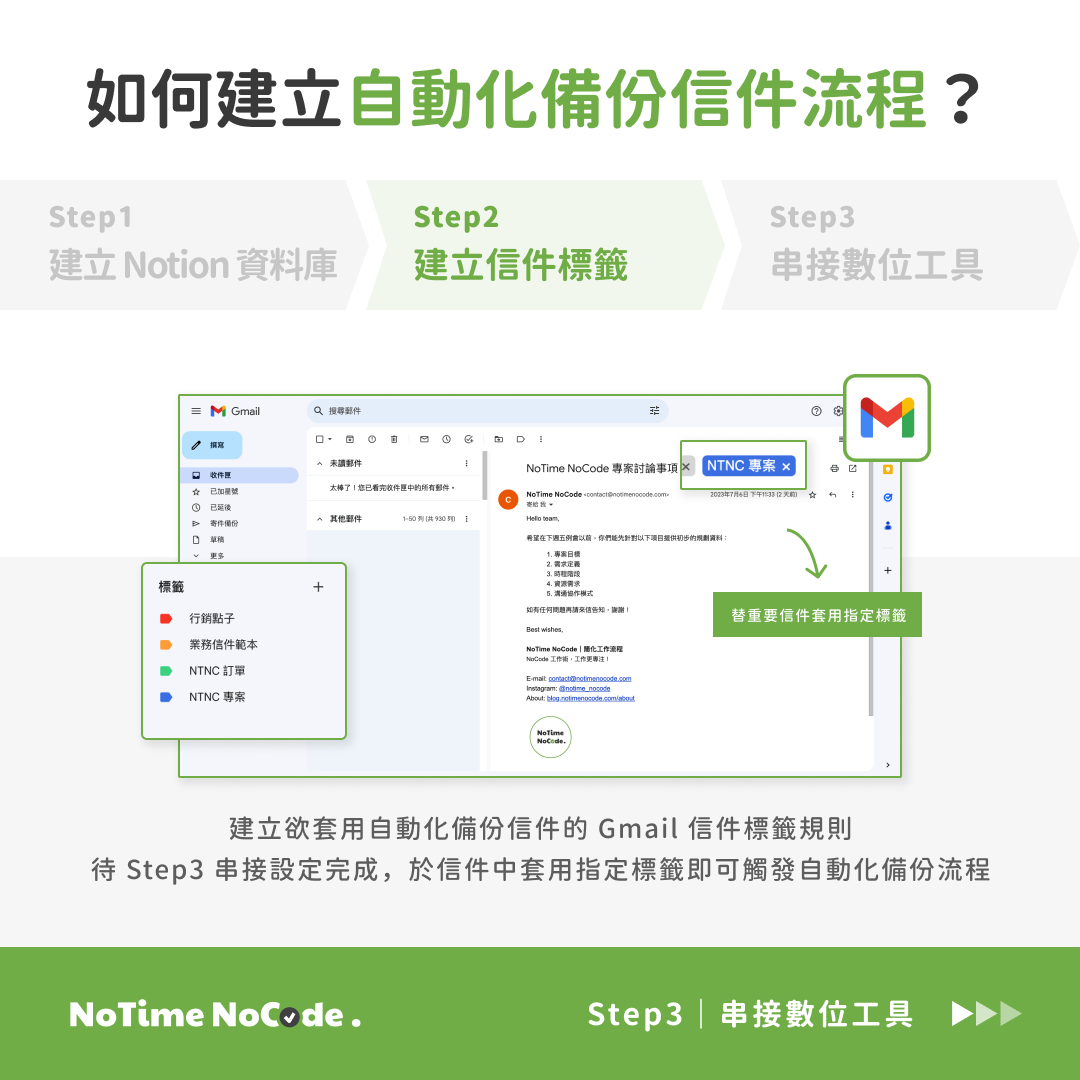 所以在這一步驟所設定的 Gmail 標籤,主要是用來方便自動化系統辨識哪些信件內容要備份的依據。我們也可以將這個標籤一起寫入 Notion 資料庫中,方便辨識不同的信件內容。