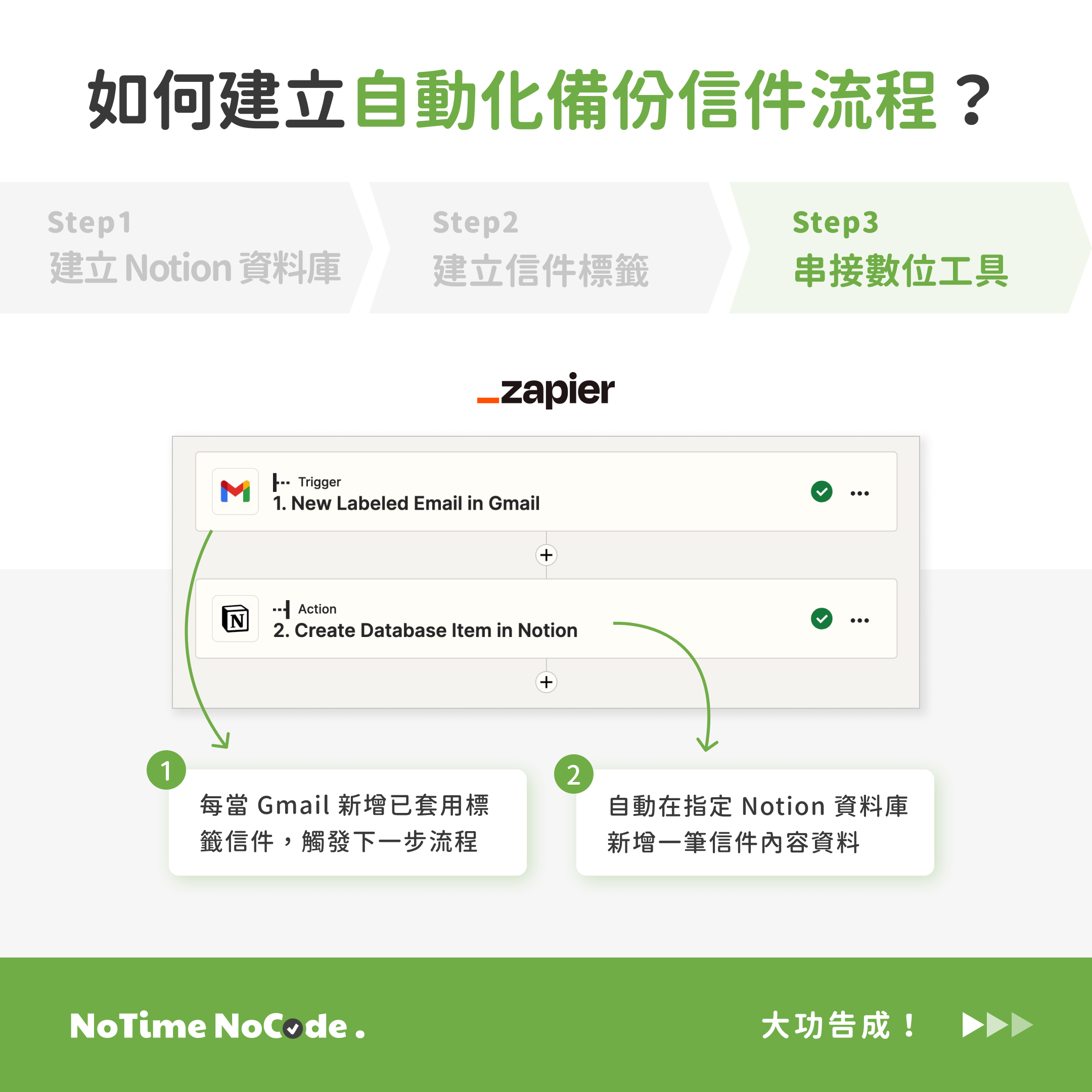 最重要的一個步驟,我們會透過 Zapier 這個自動化工具 (可被稱為數位工具界的膠水),在完全不需要寫任何程式的情況下,將不同的數位軟體 (e.g. Notion、Gmail) 串接整合在一起!