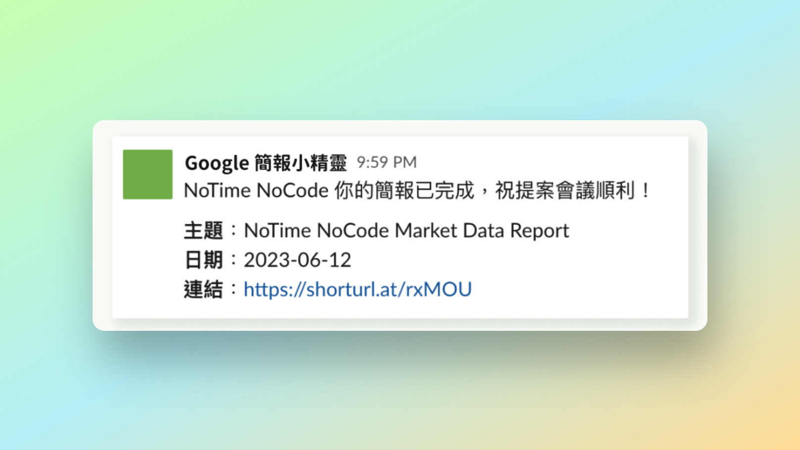 甚至也可以搭配前一個步驟,在排程完成簡報的建立後,先自動將簡報連結寄出通知自己,方便掌握每次簡報完成套版的狀況!