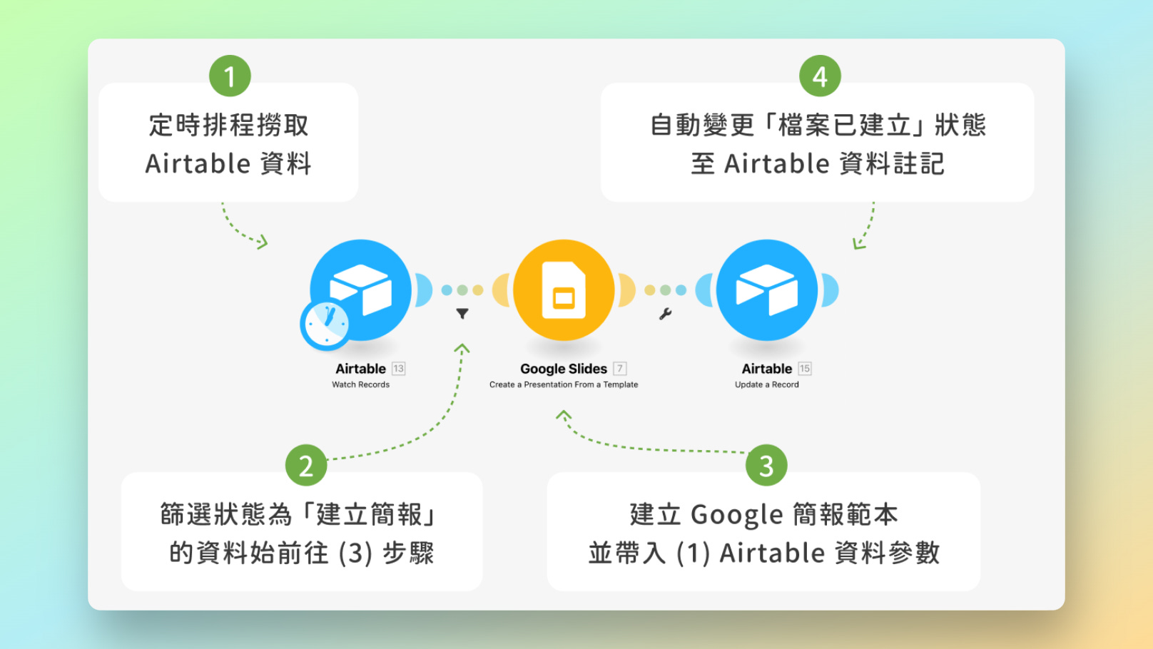 若不希望每次產生簡報套版都還需要進入 Airtable 手動觸發的話,其實也可以依據特定時間來觸發簡報套版的流程!