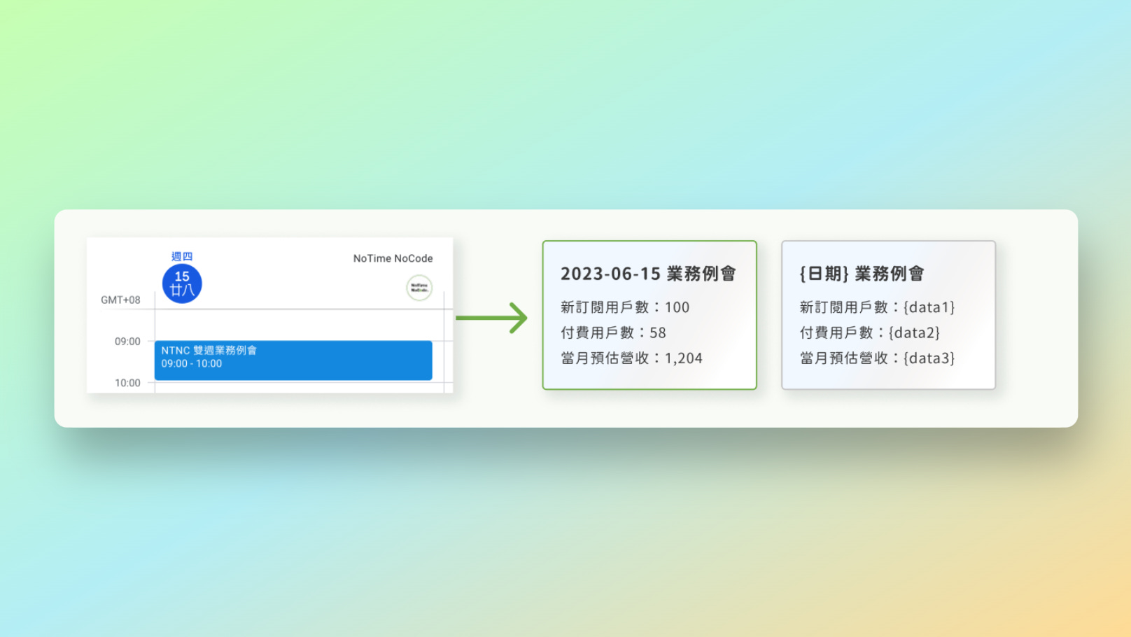 例如我們每週都會有一次固定的市場處例會,並需要在例會中進行行銷、業績數據的報告。這時候我們其實可以設定自動化流程去偵測行事曆的時間與重點關鍵字 (例如會議名稱),於例會前 2 小時,自動從資料庫撈取相關資訊帶入簡報 (例如從 CRM 抓近一個月用戶表現)!
