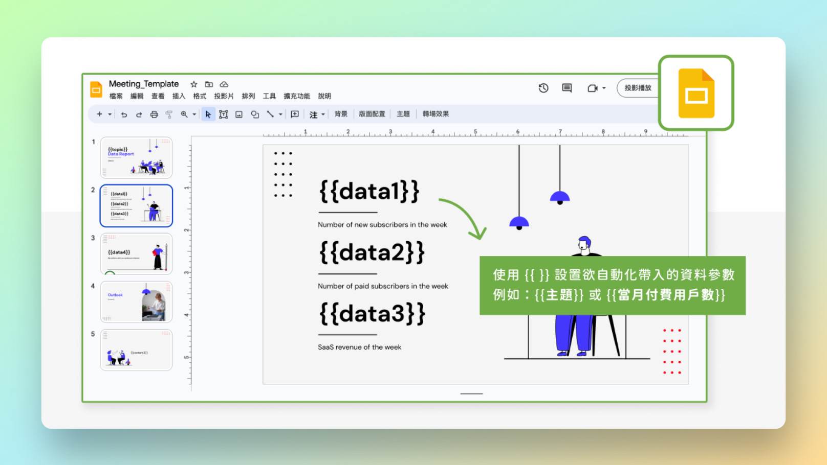 你可以自由設計與編排簡報模版內容,並且預留欲自動化動態帶入 (變更) 的資料欄位位置!