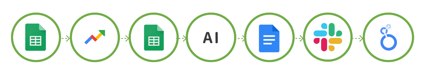 → 自動生成「本週趨勢週報」Notion / Google Docs / Google Slides 頁面與報告式摘要,推送給主管 / 研發 / 業務