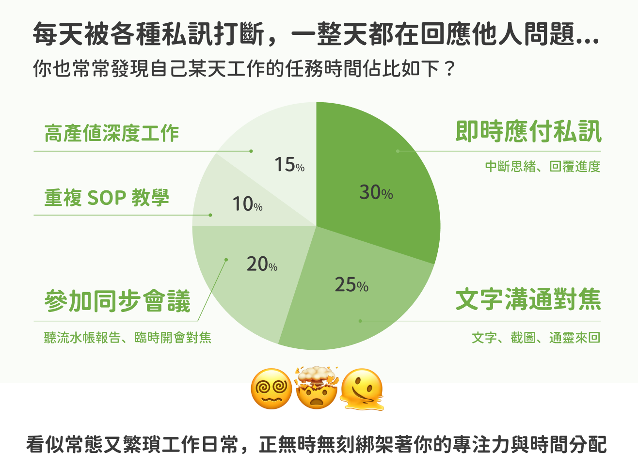 包含:中斷思緒去應付私訊問進度、坐進沒有產出的流水帳會議、打字截圖來回通靈、放下工作去教同事系統操作