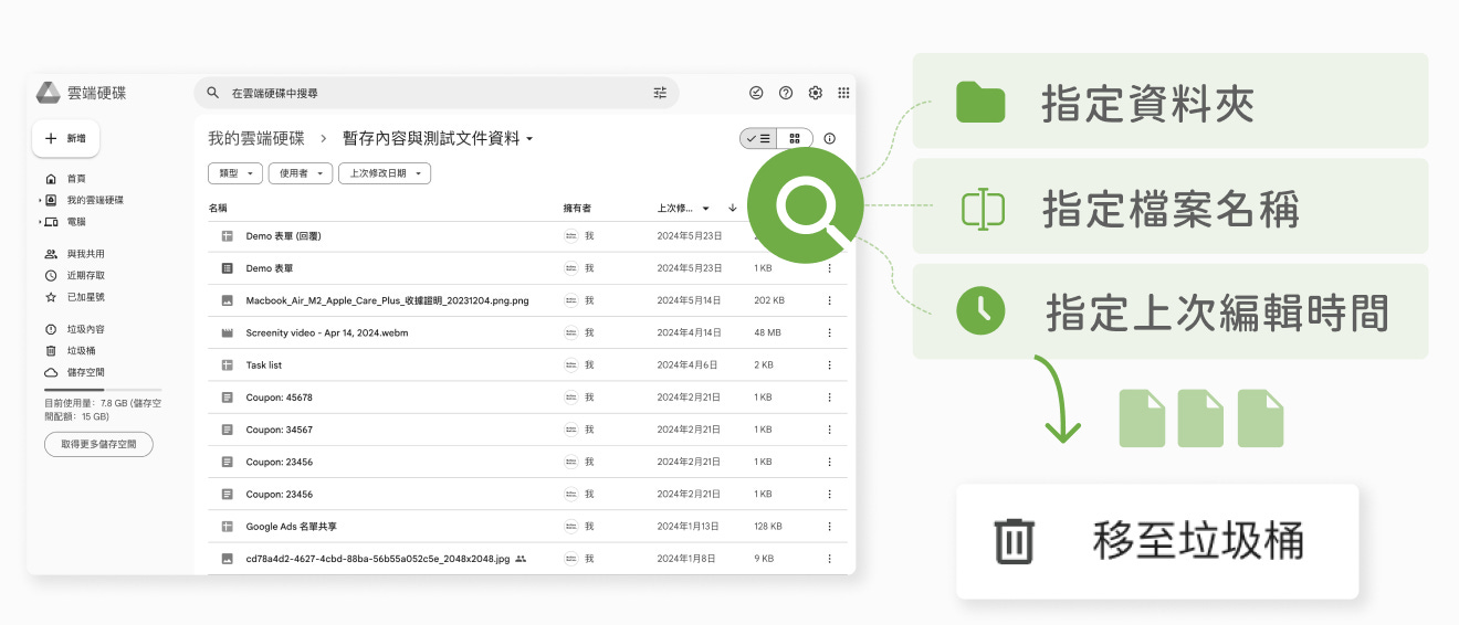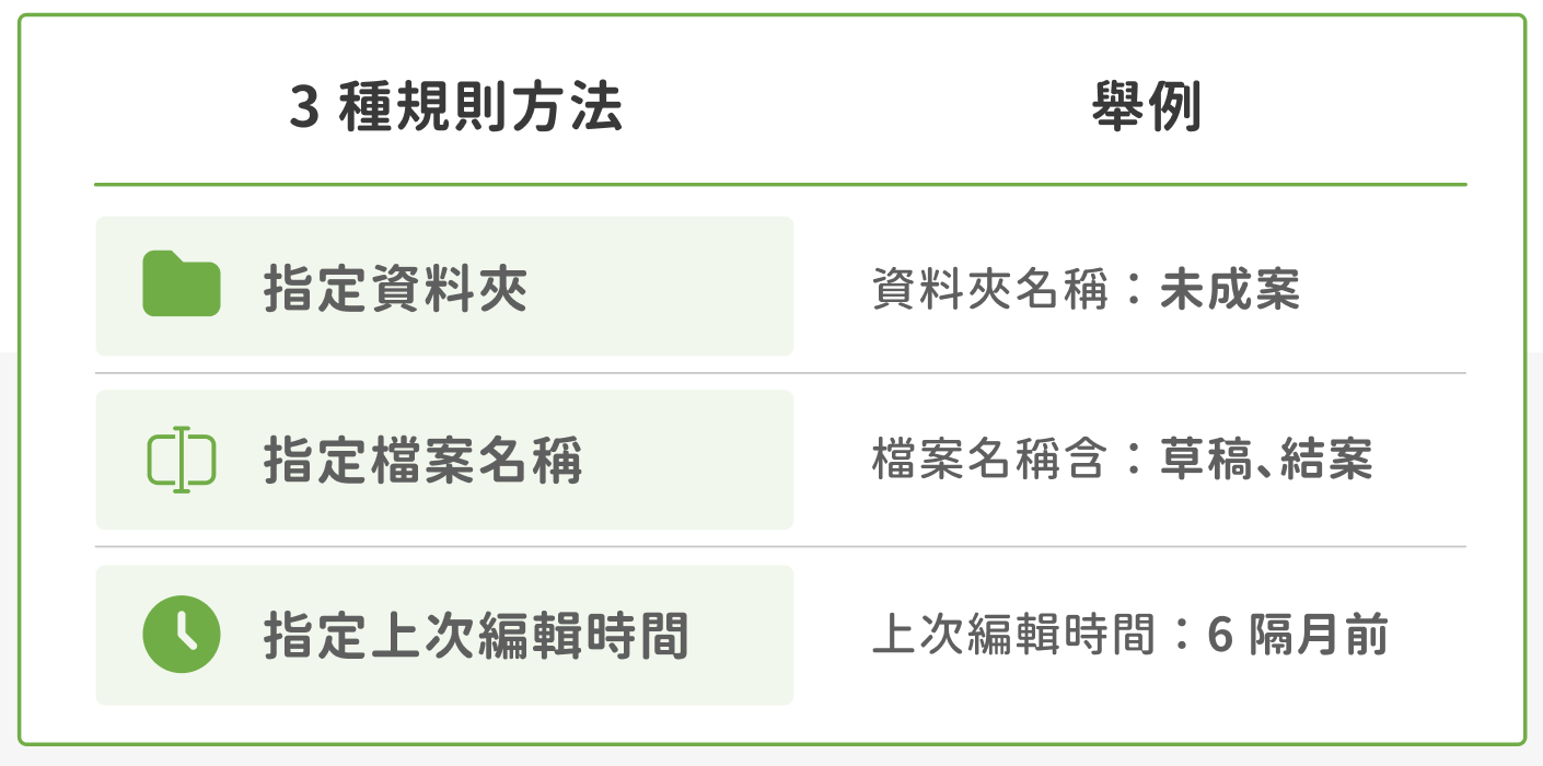 在你的 Google Drive 中,你可以透過三種方式來設定 「自動刪除」 檔案的規則,這些規則可以根據 「路徑 (指定資料夾)」、「檔案名稱」 或 「編輯時間」 來自動化處理與刪除檔案。