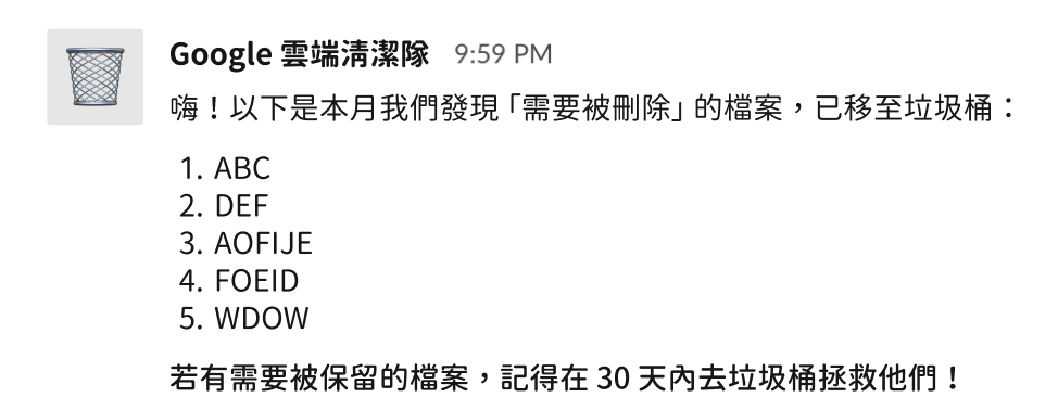 擔心重要檔案被誤刪?每當檔案自動移至垃圾桶時,系統同步寄發 Slack 通知 「被刪除的檔案清單」,若發現檔案被誤刪,你可於 30 天內至垃圾桶撿回需要的檔案!