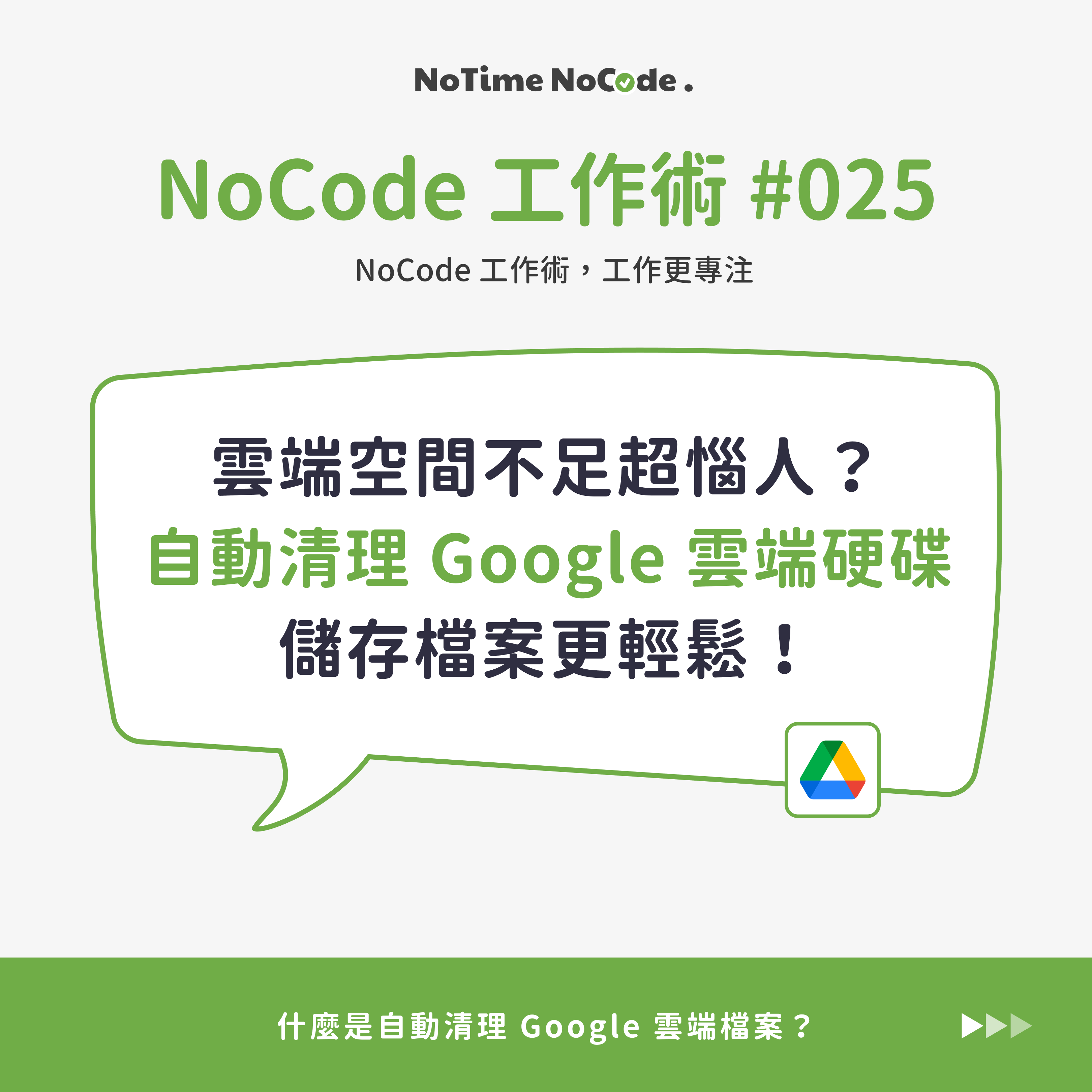 本篇內容是 NoTime NoCode 的 FB / IG 貼文 NoCode 工作術 -《 雲端空間不足超惱人?自動清理 Google 雲端硬碟,儲存檔案更輕鬆》詳細介紹說明文,歡迎追蹤我們的 FB / IG,掌握最新 No Code 分享內容!如果還沒看過貼文的朋友,歡迎透過以下連結前往社群,看看我們製作的精美圖文唷~