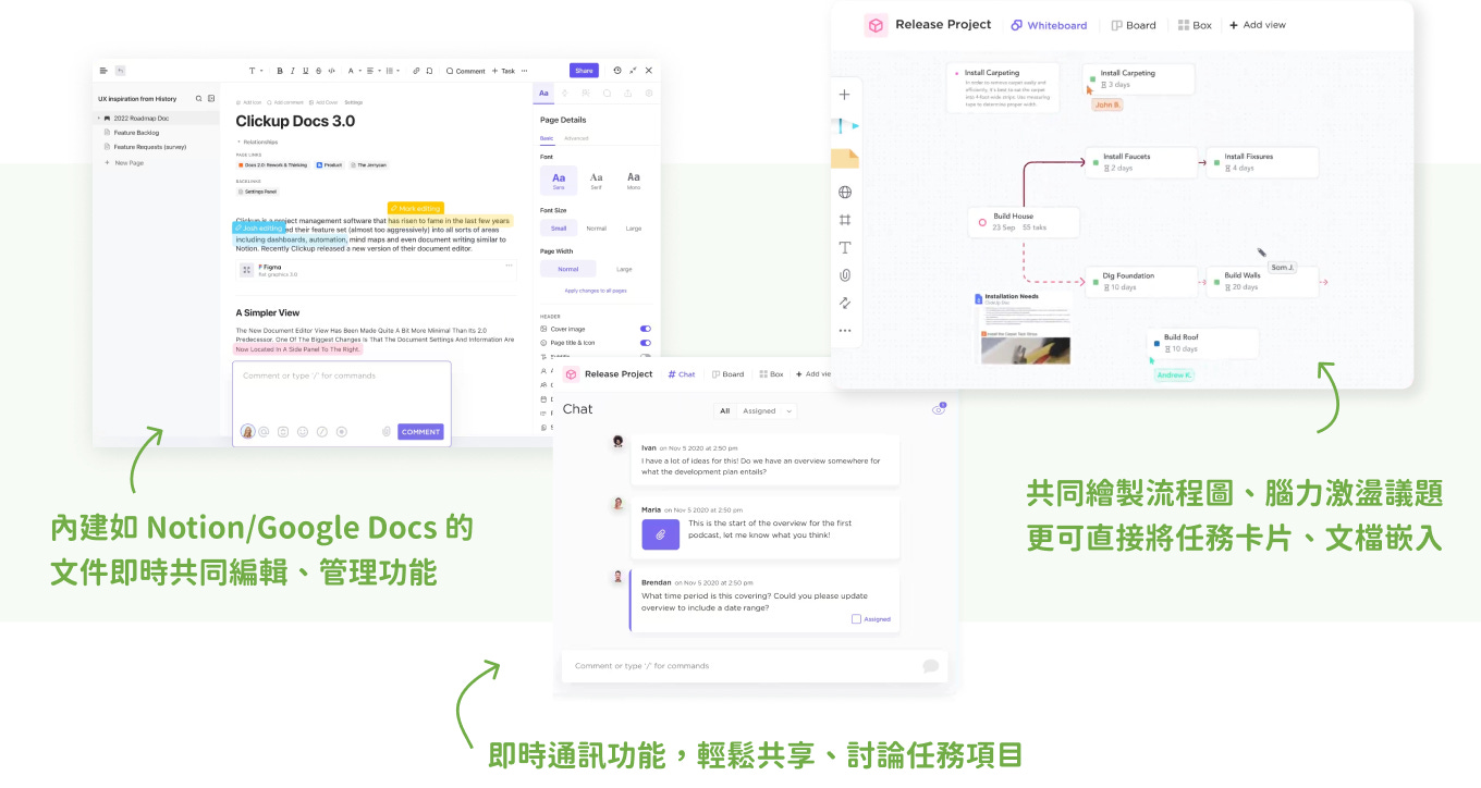 ClickUp 支援文件共編和即時溝通功能,協助你有效管理四散的資訊!