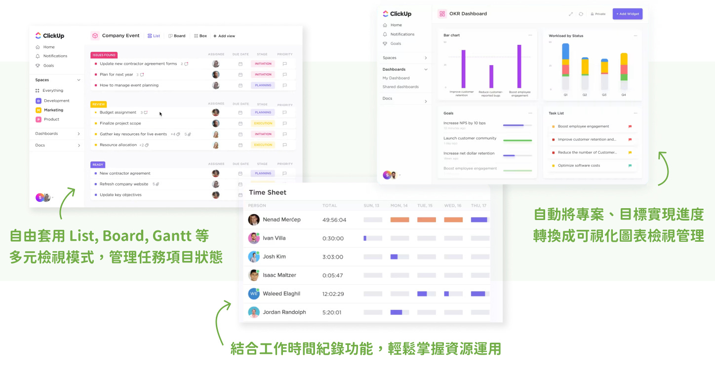 從專案任務、內容協作、資源管理、自動化流程都可以在 ClickUp 內完成,