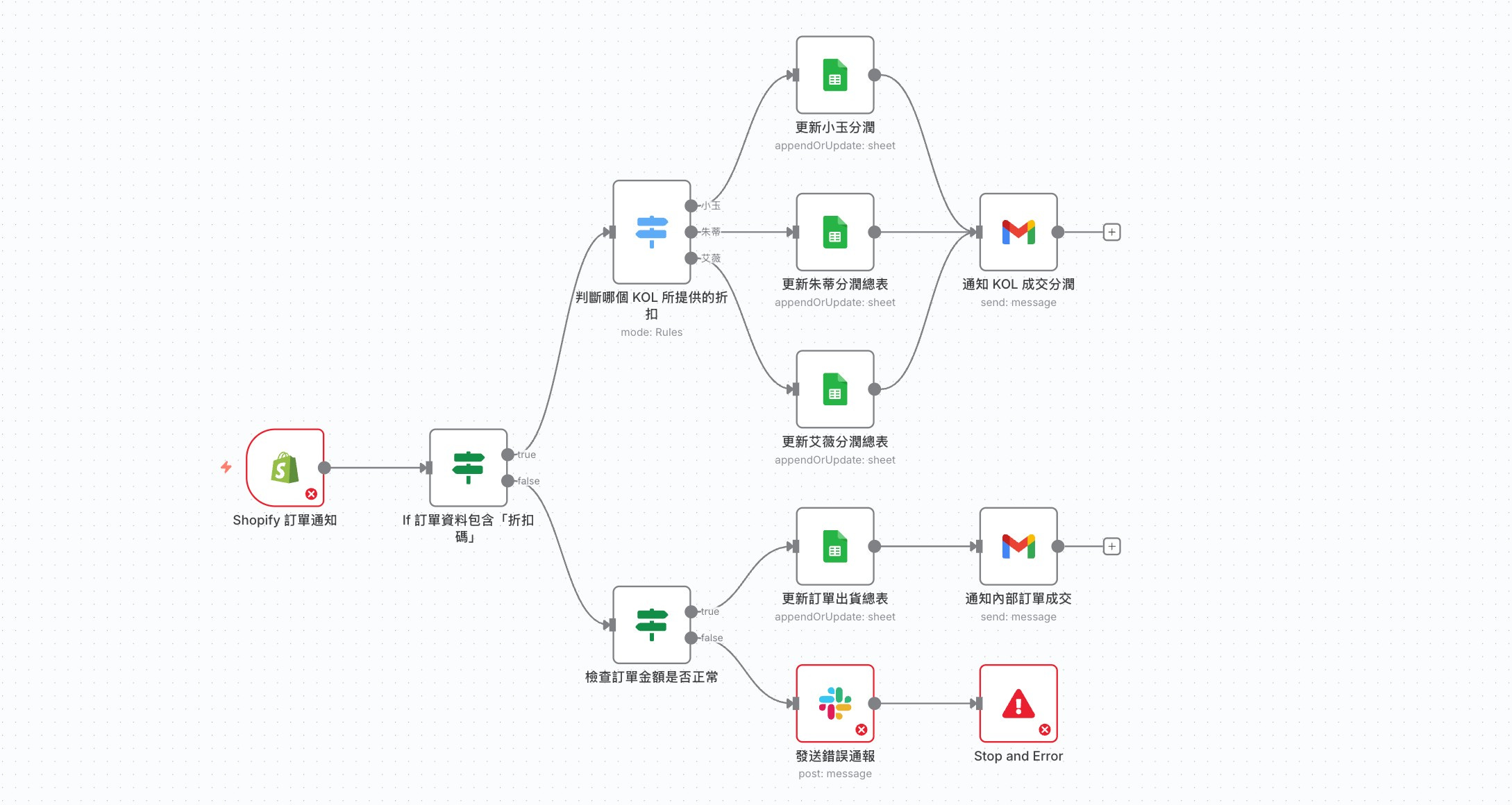 如果 有折扣碼 → 先進行數據篩選與清理,將資料填寫到「折扣訂單表」中,並同時寄出通知給相關人員。