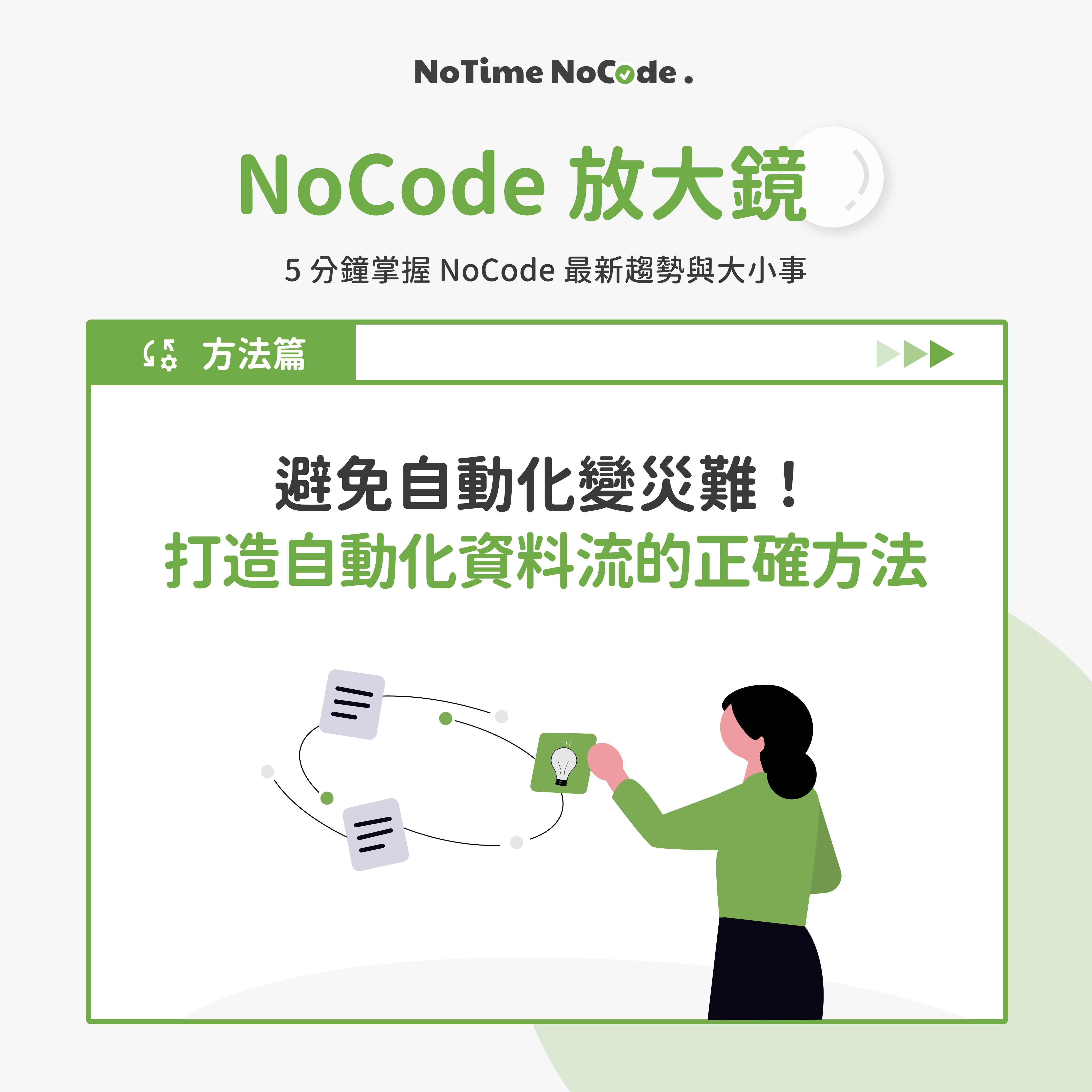 本篇內容是 NoTime NoCode 的 FB / IG 貼文「NoCode 放大鏡 - 避免自動化變災難!打造自動化資料流的正確方法」的詳細說明文,如果還沒看過社群貼文的朋友,歡迎前往以下連結,看看我們製作的精美圖文唷!