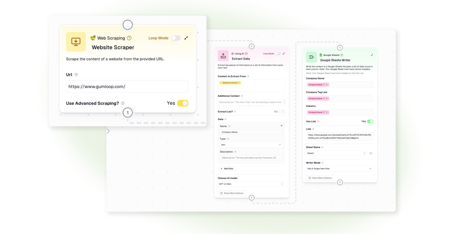 使用 AI 網頁爬蟲模組,Gumloop 即可快速抓取網站資訊、 即時掌握競品動態、生成個人化銷售郵件。靈活應用於名單開發、市場研究, 簡單幾分鐘即可完成設定,大幅提升行銷與業務團隊效率。