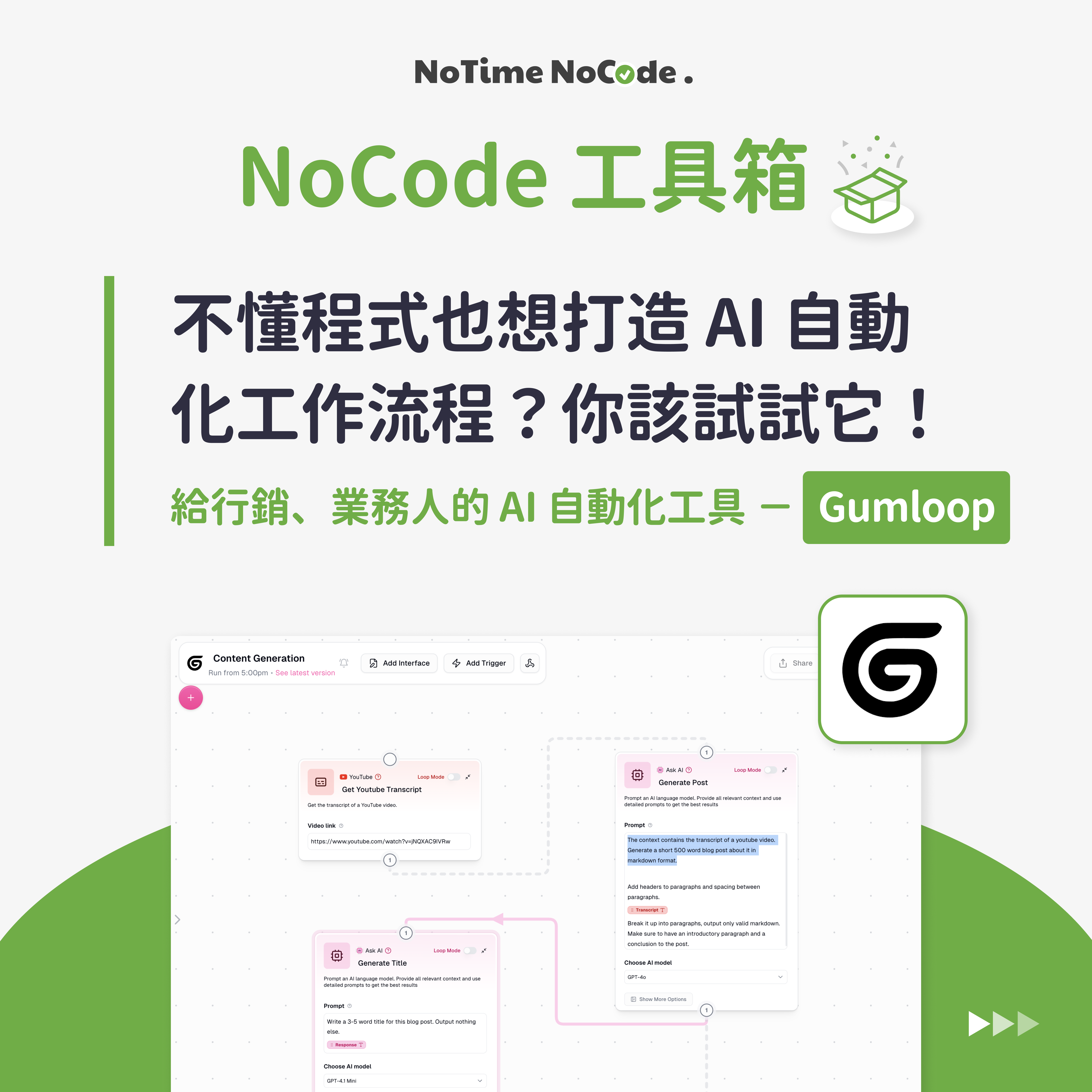 本篇內容是 NoTime NoCode 的 FB / IG 貼文「NoCode 工具箱 - Gumloop」詳細介紹說明文,如果還沒看過社群貼文的朋友,歡迎前往以下連結,看看我們製作的精美圖文唷!