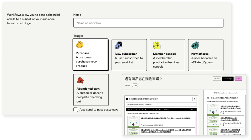對於數位創作者來說,與讀者、粉絲建立長期且信任的關係是成功的關鍵,但這通常需要花費大量時間和精力。Gumroad 的自動化行銷流程工具,讓你輕鬆設定各種「自動信件」的場景,包括購買後的感謝信、加入購物車未結帳提醒、訂閱挽留信 … 等。