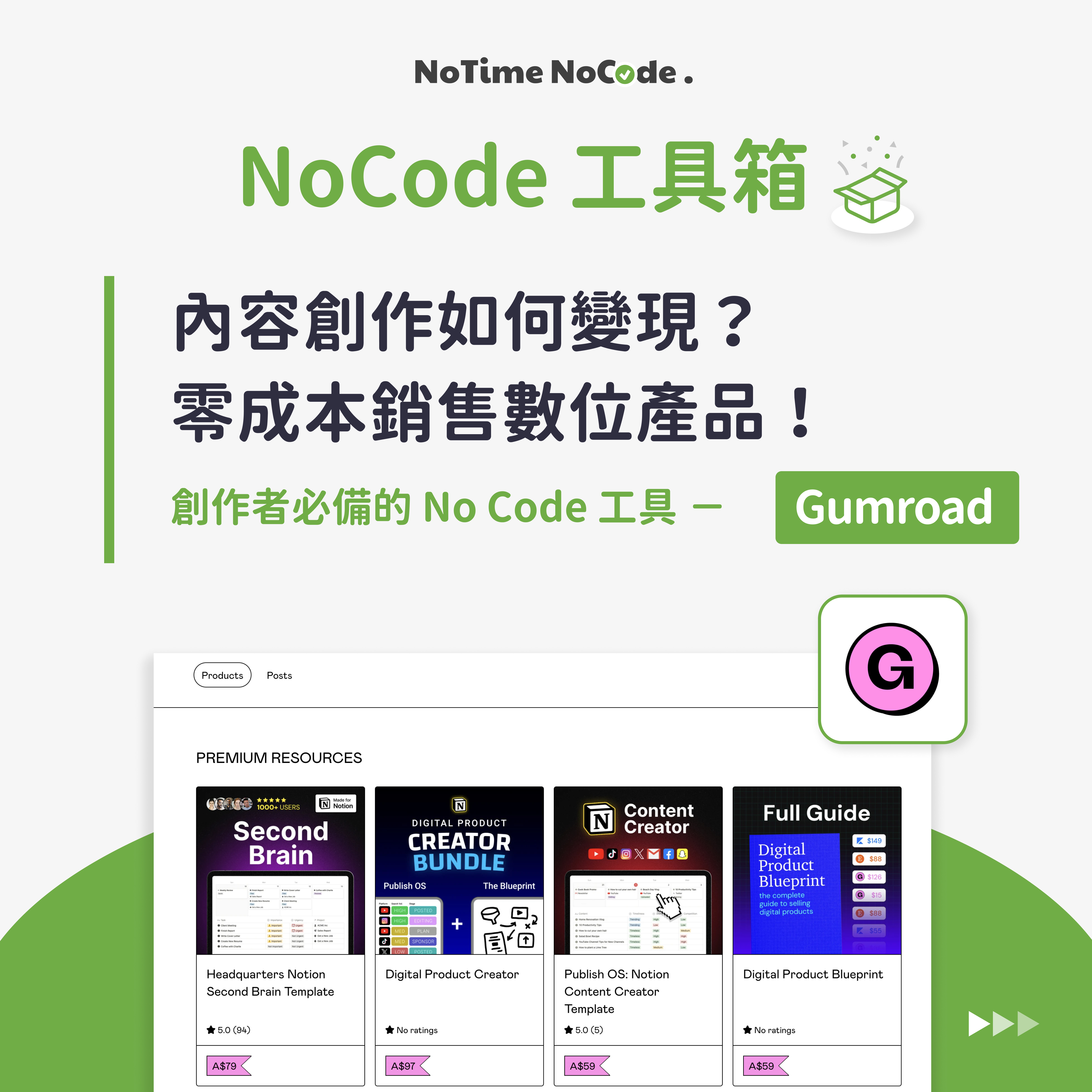 本篇內容是 NoTime NoCode 的 FB / IG 貼文 NoCode 工具箱 - Gumroad 詳細介紹說明文,如果還沒看過社群貼文的朋友,歡迎前往以下連結,看看我們製作的精美圖文唷!