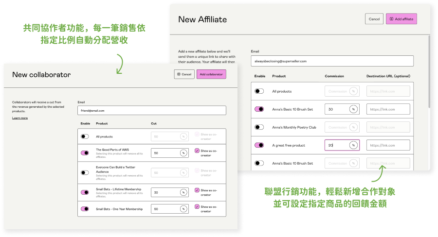 靈活管理產品和銷售權限:Gumroad 提供靈活的權限管理功能,讓你能針對不同的聯盟行銷夥伴設定專屬的商品權限,無論是提供獨家促銷連結或開放特定產品的共同編輯權限,幫助你更彈性地根據各合作對象的需求,量身打造協作及推廣策略,優化合作的價值與效益。