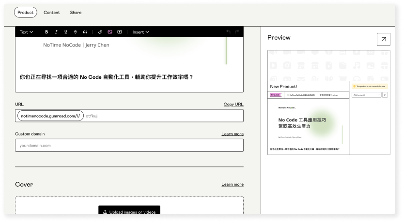 打造專屬品牌形象:數位內容的競爭激烈,擁有專屬的產品頁面和網域,能讓你在眾多選擇中脫穎而出。Gumroad 的商品資訊設定不僅可讓你彈性上傳封面和產品介紹,更允許你使用自訂的專屬網域,建立起專業的品牌形象,提高顧客、讀者信賴感。