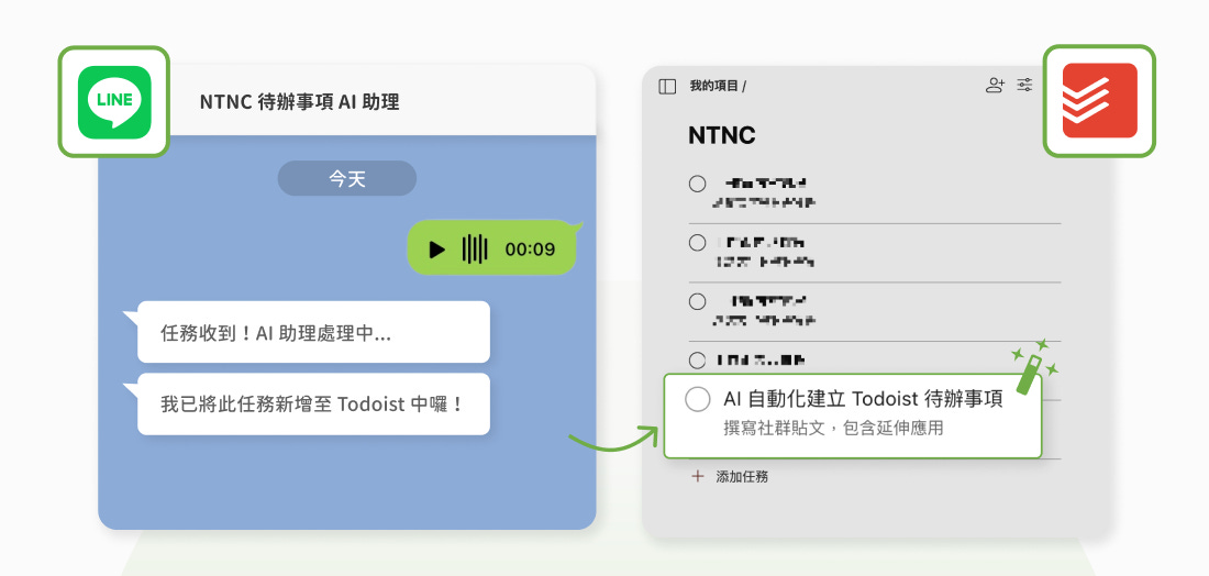 透過「待辦事項 AI 助理」,你可以直接「用說的」完成待辦事項清單!只要在 LINE 即時錄音說出需要完成的任務,或直接傳送既有語音檔,AI 會為你快速整理並同步到 Todoist 待辦事項 APP。讓你輕鬆管理日程,提升效率,創意靈感不再流失!