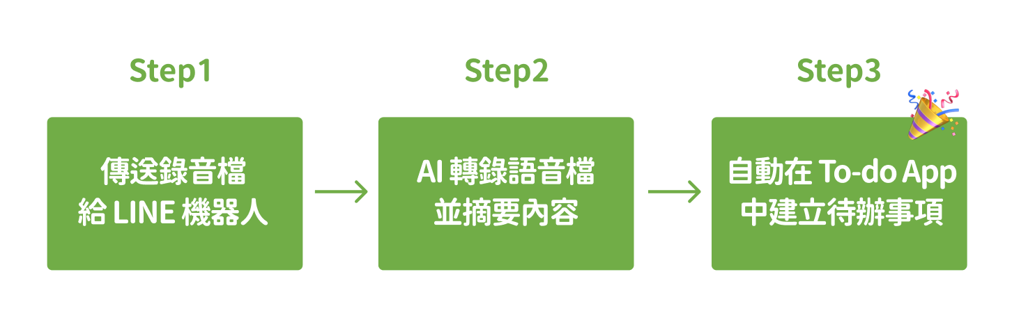 每當 LINE 機器人收到語音檔案,自動將語音檔案傳至 OpenAI,透過 Whisper 轉換逐字稿,AI 依指令生成摘要內容,再自動將摘要結果建立成「待辦事項」於 Todoist。