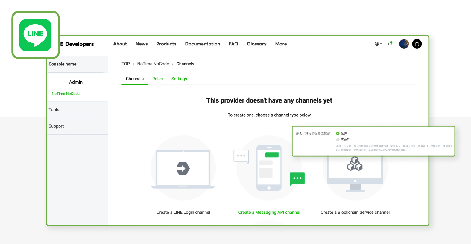 至 🔗LINE Developers 網頁建立 LINE Messaging API Channel,完成後前往 LINE Official Account Manager 帳號確保「允許」接收媒體或檔案。