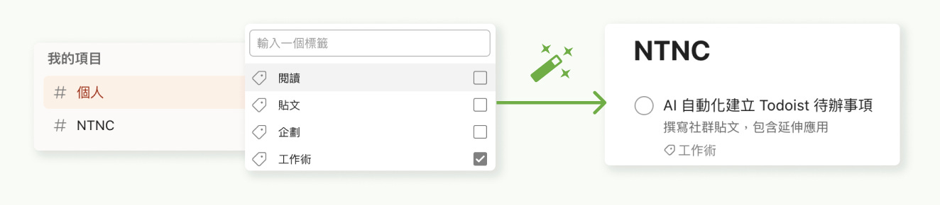 除了待辦事項內容外,Todoist 中也有 「項目 (Project) 」、「標籤 (Label) 」 等可針對待辦事項進行分類的功能。 你可以透過 AI 判讀內容並自動關聯,將待辦事項篩選至已事先設定好的項目分類及標籤。整合其他待辦事項管理工具