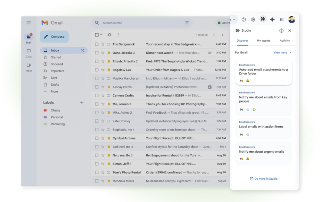 解法:Workspace Studio 直接嵌入 Gmail、Drive、Chat 側面版,AI 自動化助理「隨叫隨到」,可以快速套用多種情境的自動化範本。