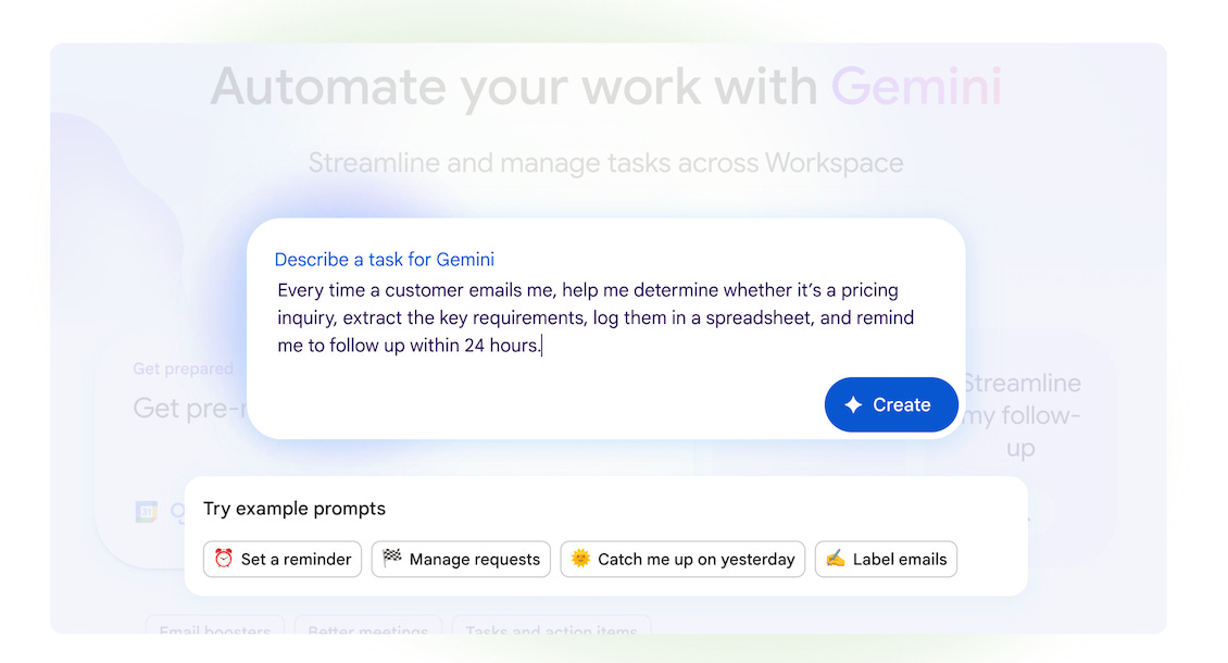 在 Google Workspace Studio 裡,你只要用自然語言描述「你希望發生什麼事」(目前指令仍以英文為主),AI 就會自動幫你把流程建好。